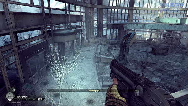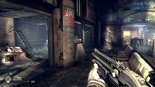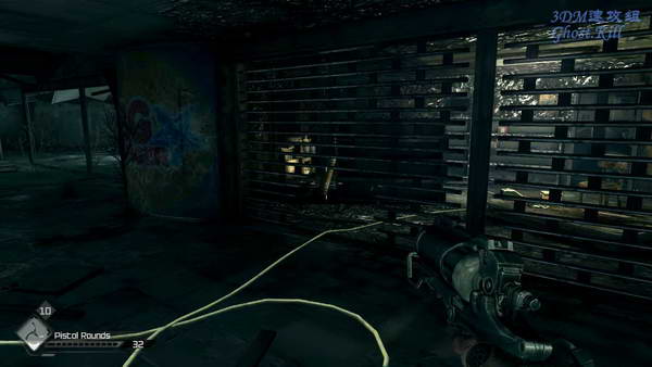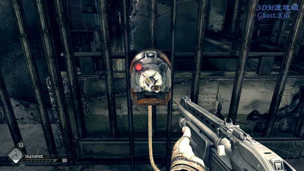 接着来到死城中心,到被锁着的电梯口这里打开开关,不过没电,顺着地上的电线来到图中位置, 打爆里边的爆炸物后门被炸开,进去打开电闸,然后开启电梯的铁门。