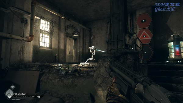 进入大门后从地上的缺口跳下去,穿过一条小道进入监狱内部。这监狱里有很多图左边这样的屏障, 需要攻击这个带发光的罐子,随着攻击管子上的能量条越来越低,消失后屏障就会关闭。