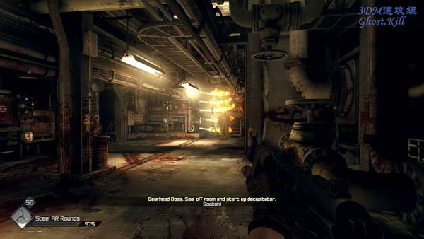 二话不说直接火箭筒伺候吧,或者霰弹枪的火箭弹,这些杀伤力都非常可观,BOSS血是高级兵好几倍厚, 所以也要用掉不少弹药才能干掉,杀掉之后使用他身后机器的开关可以完成任务。