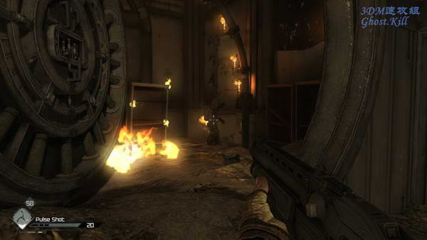 图中这个房间,进来之后就会被火挡住去路,火的另一边会出来两个拿机枪的高级兵,幸好这里掩体很多, 一般应该不会很容易被打中,杀掉他俩之后活自然毁灭。