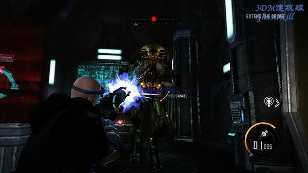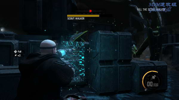 再杀过几个房间后遇到队友,和他交谈之后进入房间遇到敌人伏击,这个体型较大的敌人, 直接用等离子炮攻击,不要离他太近了,他的攻击还算比较容易躲开的。