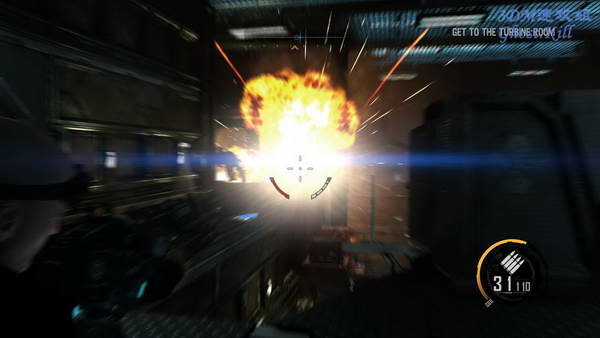 按Q使用冲击波破坏掉几扇门之后和敌人遭遇,一如既往的敌人旁边有很多可利用的爆炸物, 打爆之后迅速清理掉敌人,冲击波对付敌人也十分好用,到中后期但要紧缺的时期这是主要攻击方式。