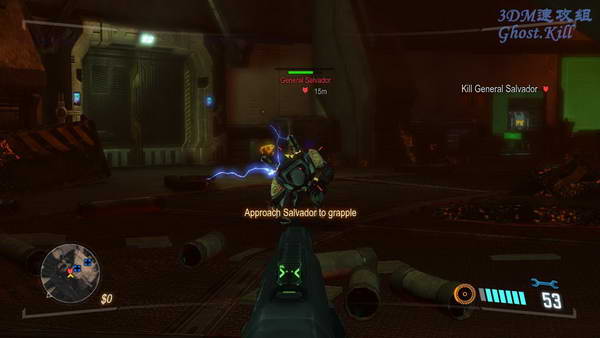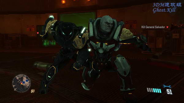 等把他打趴下后过去近身按E把他背上的电池扯下来,一个四个,前三个都扯下来之后会来个增援,不过是BOSS的增援。不需要理那个增援,集中火力对付BOSS,他再趴下后近身按E进入CG,通关。