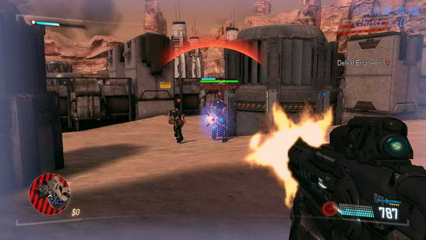 出来之后看到友军正和敌人交火,出去帮忙,杀光第一开始的杂兵后会来两个工程师,大门会呼叫空投机甲和自动机枪,找个距离近,退路好,掩体多的地方用霰弹枪全部干掉。