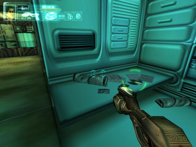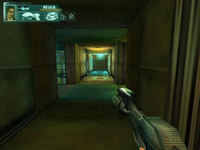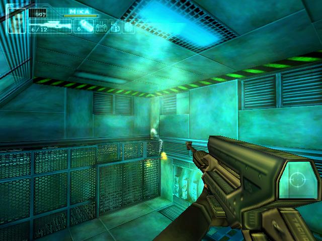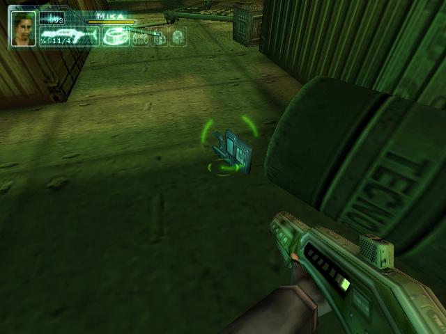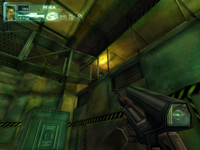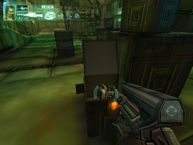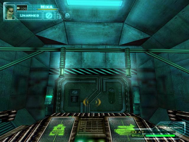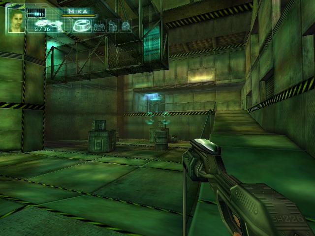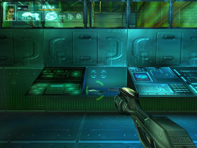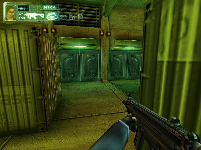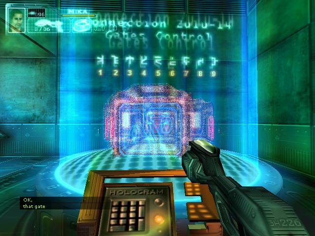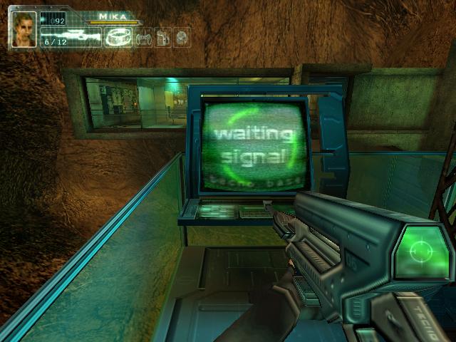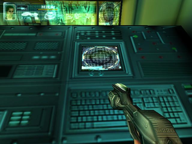 拿到枪后到2楼把柜子锁打开,得到资料。然后到大厅打掉桥上电子门的开关,左右各有一个。打掉后去右边,坐电梯下去后看到门开关有三个图形。然后回到旋转楼梯那,去楼梯后面的房间,进去后要和一个人对话,说话的顺序是:GEOMETRIC SHAPES回车,room回车,set-up回车,yes回车,yes回车,square hexagonal square回车,yes回车。回答完后他就会去开那扇有三个图形的门,再去一次那里,拿到卡片后和眼镜组合,然后去直升飞机控制塔旁边的楼梯。下去就到了四扇门。