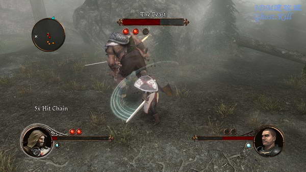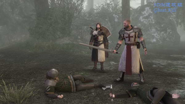跟着脚印来到尽头后操刀草丛里,之后BOSS出现,看到他冲过来的时候滚着躲开,然后绕到他背后攻击,他会把AI当成第一目标,看他想要攻击的时候在滚着对着,他会向周围砍两刀。
