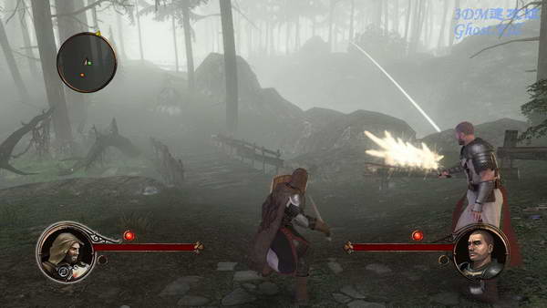 来到一个树林中,四周大雾,在小路上前进,到前方的断桥处查看一下,然后沿着悬崖走,远处是不是的会有弓箭飞过来,听见声音的时候按住空格防守。