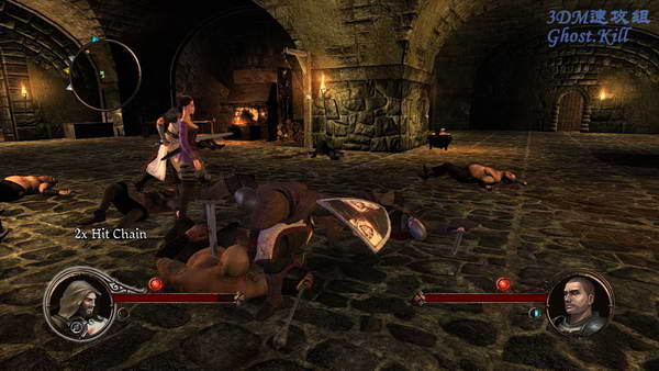 下层是监狱,按住shift在背后偷偷接近两个守卫,按左键一人一个扭断他们的脖子继续前进,前方三个敌人在巡逻,等他们背对我们的时候过去一个个暗杀掉,然后继续下楼。