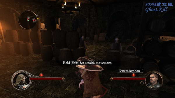 到酒窖这里按住shift潜行,进屋后两个守卫会起疑心,去最左边的酒架后面躲着,等两个守卫绕一圈回来后从他们背后悄悄离开,去下一层。