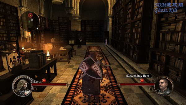 从教堂里不能使用武器,上二楼后直直走去见神父,不过这神父显然不是什么好东西,谈完之后跟踪他。到了他房间之后看着他进入了暗门,跟着他进去,到书架那里按E开门进去。