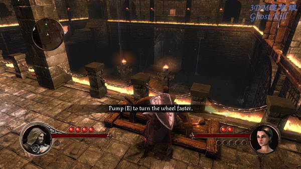 来到一个地下通道中,这一关感觉很像波斯王子。拿上一支火把在火盆里点燃,然后按tab切换角色,两个人都拿上火把后继续前进,路上还是遇到推杆就要拉。