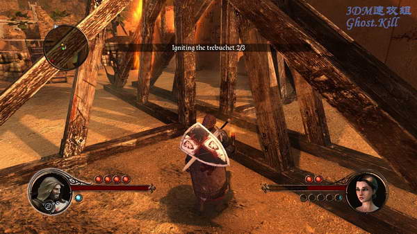 然后去火盆旁边那上火把,点燃之后去烧掉投石机,要点燃投石机的三边才可以,然后会有一群敌人杀过来,杀光后继续前进。