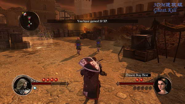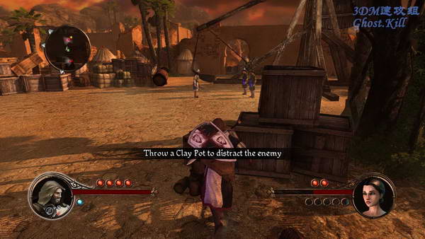 到了敌人投石机这里,有三个守卫,过来拿空罐子扔到相反方向把敌人吸引过去,然后在背后把三个敌人暗杀掉。