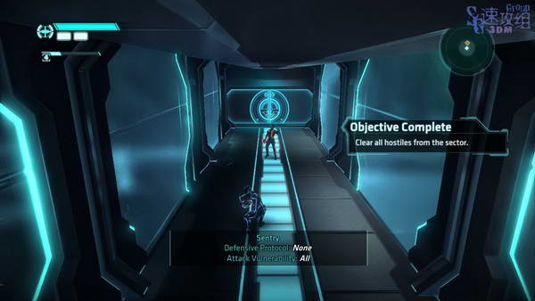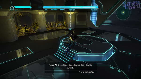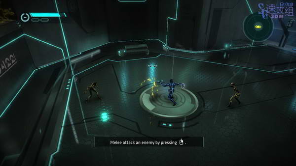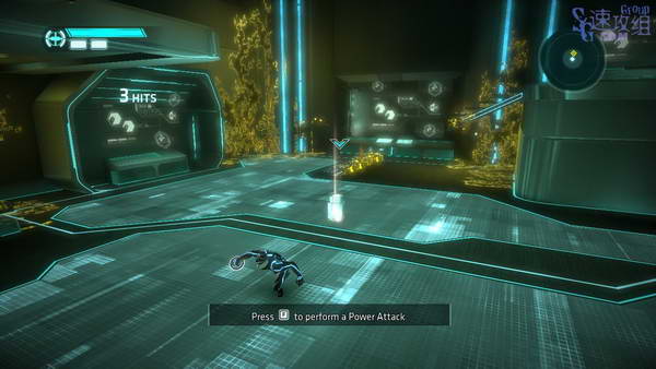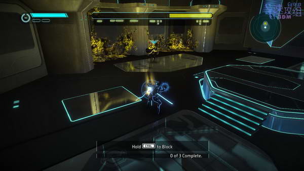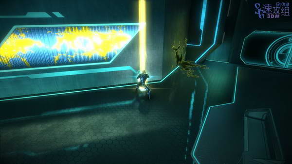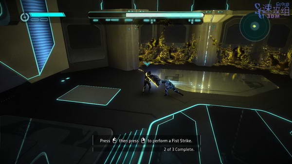 进屋后干掉屋里的敌人,出现新敌人,拿盾牌的,按crtl加F攻击,两次就可以破坏掉他的盾牌,前提是要有能量,房间里有补充能量的地方,按住shift跑到发光圆柱体那里就可以,补充过一次能量后需要过一段时间才能再次补充。破坏嗲盾牌后按照何一般小兵的打发干掉他就可以。
