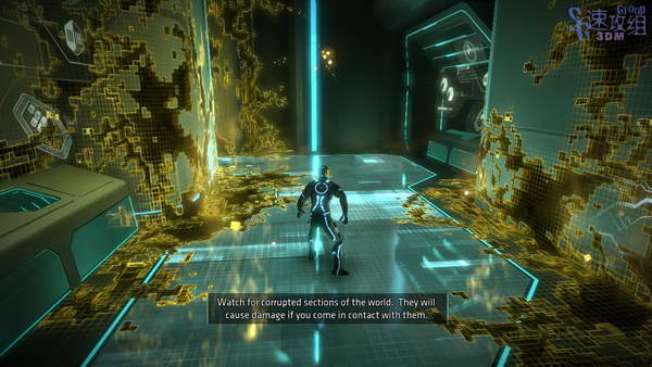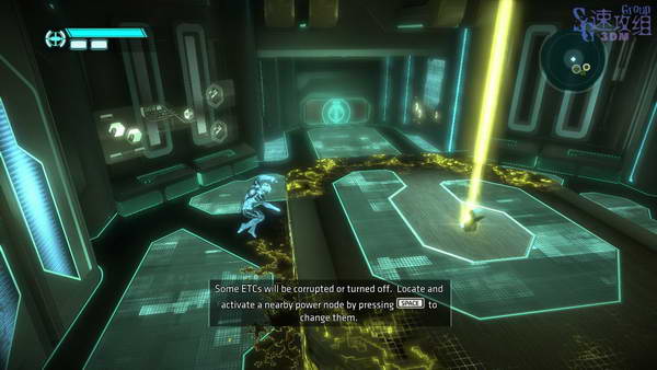 进来之后到回血的能量条那里shift爬上去,然后按空格跳到中间的平台上,在黄色发光体那里按空格,之后前面补血条的黄色物质被清除,从那里爬到爬上去后到另一个房间。