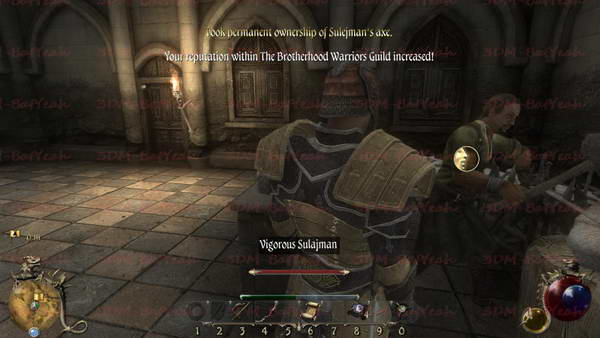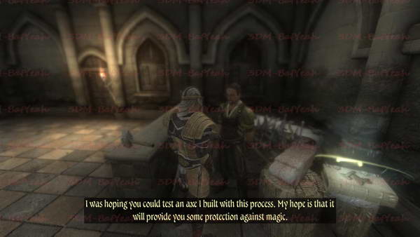 一直前进到BROTHERHOOD,同中间的首领对话。接受他的任务请求,然后同一旁的铁匠说话,他会送一个斧子。让你去后面的竞技场的战斗来测试一下这个斧子的威力。不过他送你的这个斧子并不是什么好武器,其实还不如