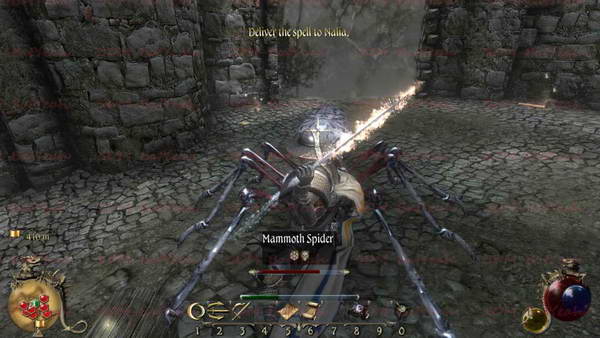 拿取箱子里面NALIA的笔记之后,会从天而降大量的怪物来同你作战。建议用火系群攻魔法烧死这些家伙,当然你也可以直接冲出去不理他们。整个区域还是比较开阔的