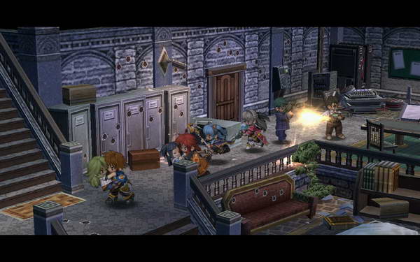 罗伊德相邀,银加入队伍(银的导力器外壳居然是八卦,莉夏是武当的吧?会打太极拳吗?),来到医院食堂宿舍大楼内救出人质后在天台上放倒的黑帮成员身上搜出了钥匙,立刻前往医院,罗伊德的姐姐塞西尔还在危险之中。
