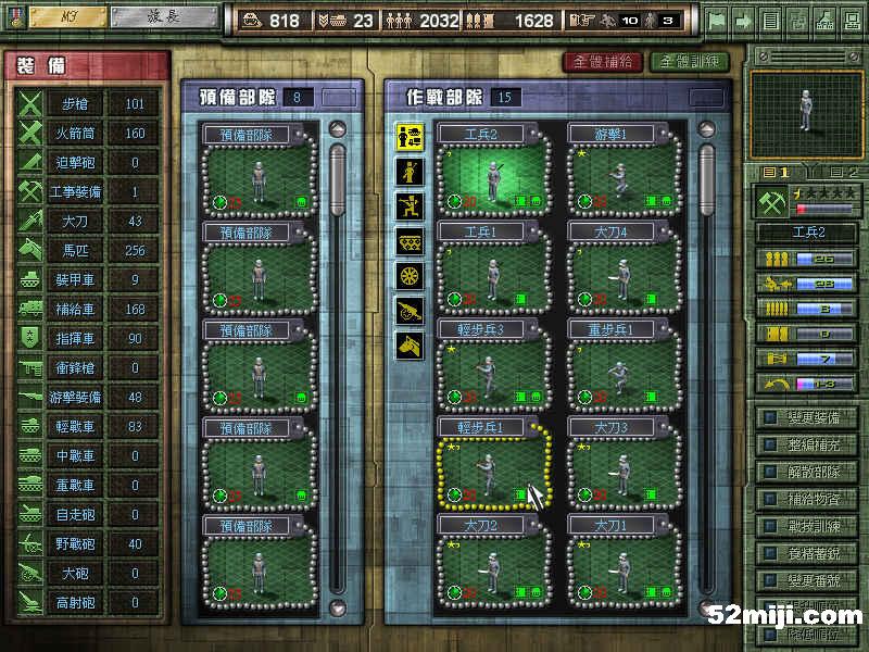 战前组2支工兵(物资够的话尽量满员,布雷一次约10点经验),再组一支大刀队。