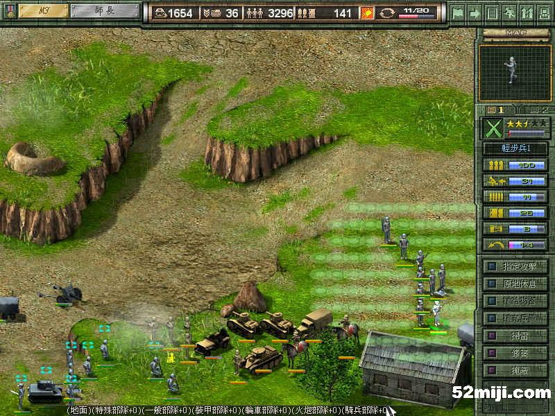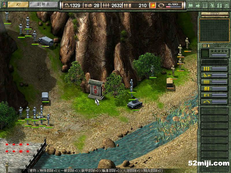 主力沿左路向下,接近敌人时就地布阵,近程兵在下,远程兵在上。由于上山耗机动力多,1合只能前进2个位置,这时应该有1合灭2人的火力了吧,注意敌人射程内的步兵要隐藏,且布阵时确保敌军不会移动到贴身。对付指挥车时,可以直接上去打残,它就会自己补充,而不会空袭了。这路无伤亡。