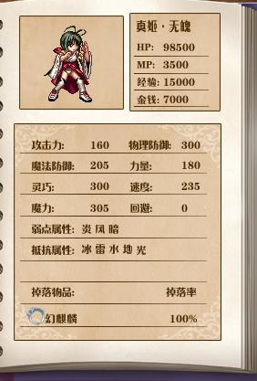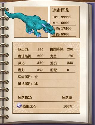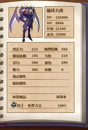 这。。。。。。。。是偶眼花了还是游戏出BUG了?剑王的能力真吓人~不愧为当年弑神之人!!首先没特别的弱点属性,这使得魔法攻击战术失败,但如果冰儿魔力到达极限,装备神石的话伤害还是可观的。。其次速度,灵巧极高,尤其是灵巧605这数字在全2BOSS中也是屈指可数的。。速度较之前的大幅度上升,此时来挑战是个错误吧?!囧,魔力<力量可知其攻击大多为物理性,SO战前注意装备物防较高的防具,免得进入战斗后由于物防过低被秒杀。。总之要打起十二万分的精神应战,也许剑王最大的弱点就是HP较弱。。这就是偶们唯一的胜算,强攻即可。。。祝大家挑战成功~