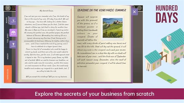 Hundred Days游戏是一款非常好玩的休闲益智模拟经营游戏,扮演成为酒庄主人的玩法,可以通过各种古法进行酿酒销售,自己拥有着种植葡萄的果园,各种不同的水果搭配还可以酿造出不同口味的酒,而且游戏的画面非常清新,各种酒色香俱全,了解各种葡萄的生长周期也是非常有必要性的,感兴趣酒快来下载体验吧。