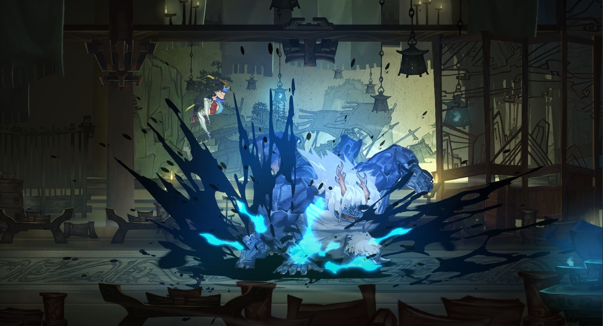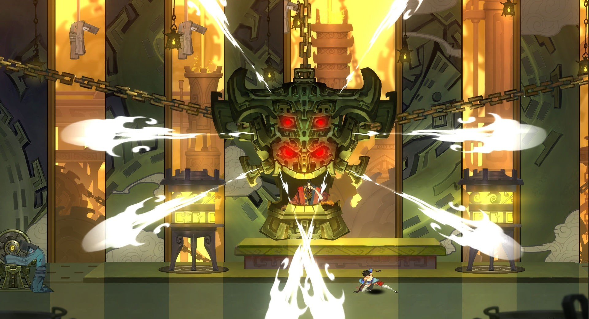 美术表现上,我们借鉴了团队成员非常喜爱的《胧村正》中的大胆鲜艳的色彩,以及夸张的肌肉造型,在此基础上运用了中国水墨画技,以及传统戏剧元素,整体呈现出独特的国风美感。