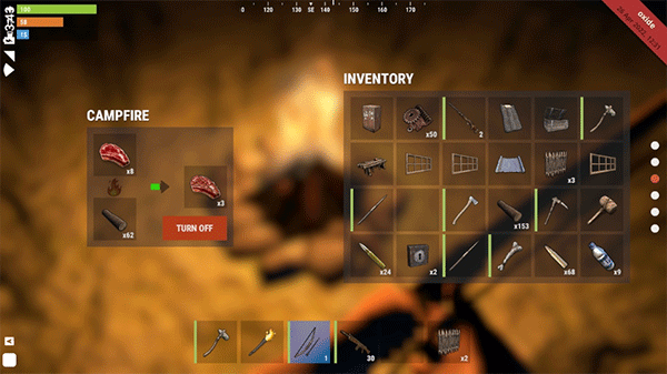 先不要急着造家,因为每个服务器的地图都是随机生成的,所以一开始,我们应该到处走走,找物资刷新点(大铁球,工厂,核电厂,卫星雷达,峡谷等),随机看运气,看看会碰到什么辐射区,比如我就走到了大铁球,找到辐射区之后,立即拿你的石头去砍树10下,采集100木头,然后捡地上身上的“麻类纤维”,采集30个布,然后打开背包制作一个睡袋,放到快捷栏。