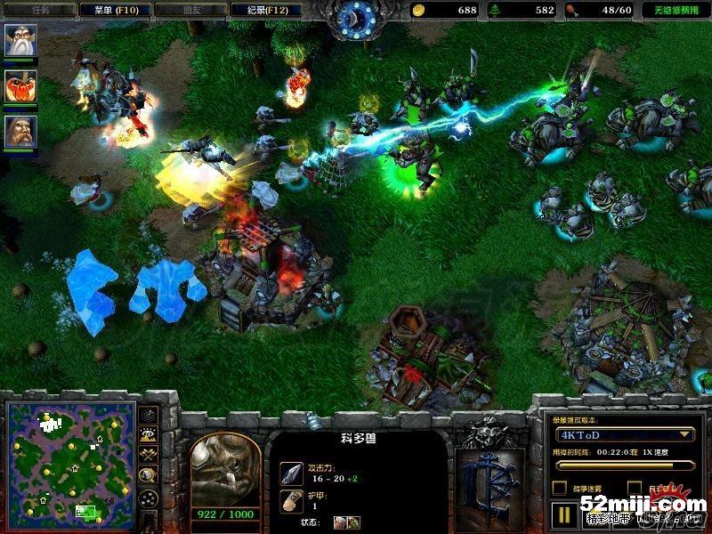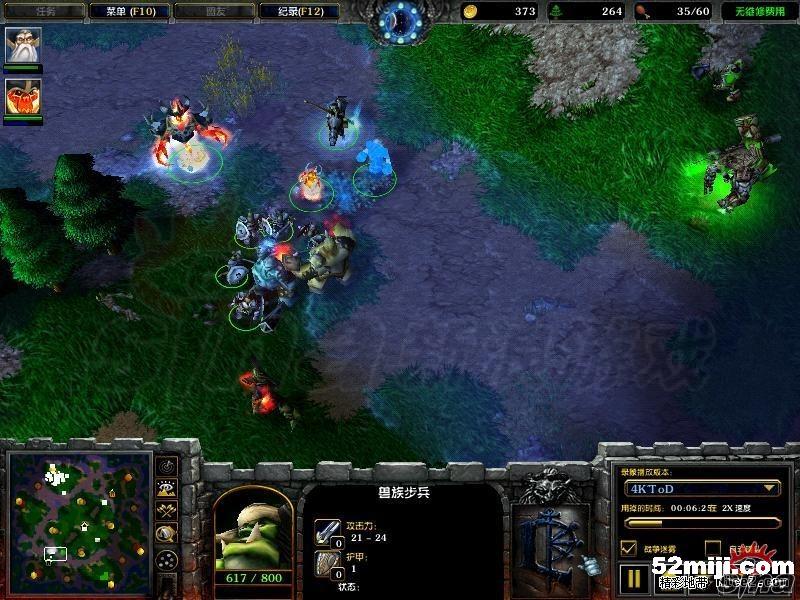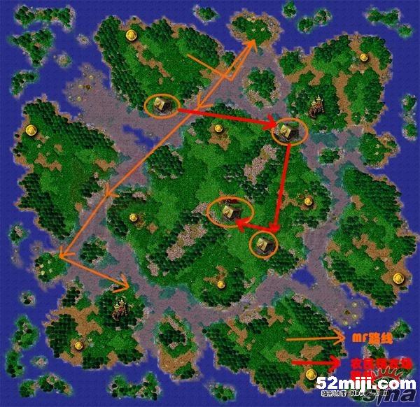 由于TOD和GRUBBY分别降生与11点和5点的对角位置,TOD放心的选择了先步兵4422食人魔,再MF海龟然后沿该路线逆时针向ORC基地方向MF,并在第一个探路农民被杀后拉出一个农民在2点的商店附近放下了农场用于侦察,随后又3点和6点海龟之间的2路口交叉位置和中部的酒馆位置建造了农场。TOD的这种MF与侦察方式在不久就收到了效果,在逆时针MF完9点的4422食人魔后在8点商店位置逮到了正在MF商店的ORC。