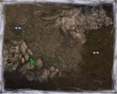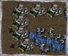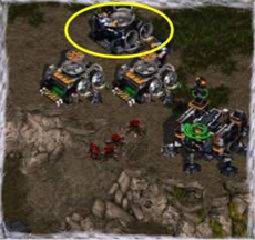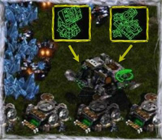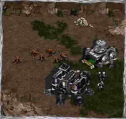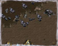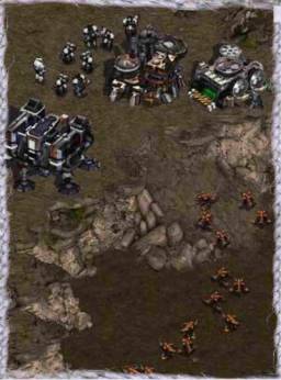 Protoss玩家喜欢利用Dragoon把T封起来,边打边退,然后疯狂扩张。此法可以有效的限制Protoss的扩张:派两个有3颗地雷的秃鹫溜出去(根据实际情况的不同有的时候很难溜出去,这需要tank的支援)把这两个秃鹫派到另外两个主矿(就是高低上面的)布下一颗地雷,剩下的两颗布在狭窄的路口,如图。(通常Protoss的扩张都是在另外两点的主矿上的,因为在高地上空投tank对Protoss的威胁太大)