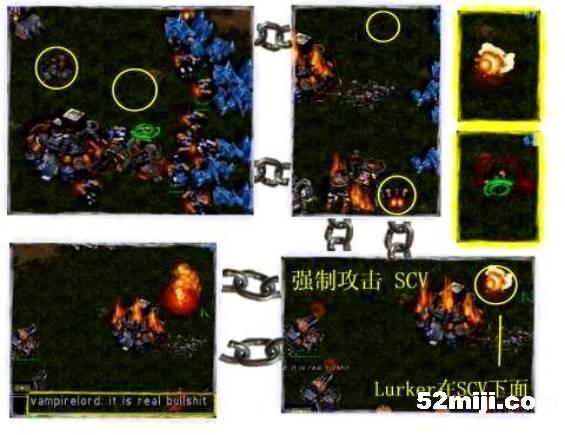 首先把农民全部拉走,等到1~2个tank 并升级好了围城模式之后把它们架在lurker打不到的地方。派一个满血的scv move到lurker攻击地点的发源地(也就是lurker埋的地方)选中你的tank, 按A, 在scv到达lurker所埋的大概位置的一刹那(越准越好)用tank强制攻击你的scv, 你发现你已经送了一只lurker上了西天,而那个scv挨了两炮居然还没死!(又一个Bug)同样的办法,派另一个scv过去然后强制攻击它,这样基地里的为难就解除了。我在给吸血鬼王用这招的时候他不禁发出了Bull shit的感叹!