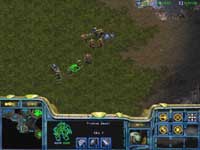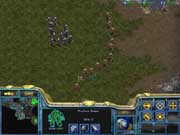 假设我们控制的是赭石方,我们将全队框住,先是用的“A”键攻击,我们发现有一个狂热者的血下降的特别快,对,就是这个,于是我们用鼠标在编队框中点选他,然后让他后退,大家可以看到他已经退出了战场,而先前在和他撕杀的两个狂热者则不得不转向攻击另一个狂热者[见图3]
