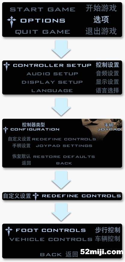 2. 手柄设置:分为两类,步行控制 和 车辆控制