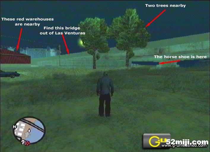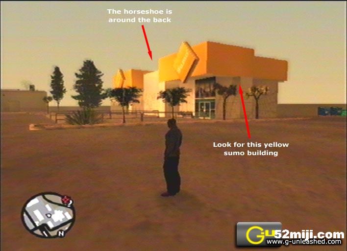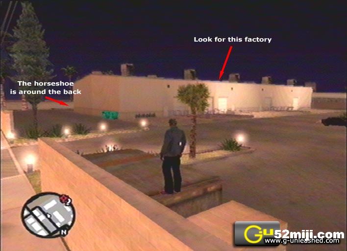 圣安地列斯马蹄铁的收集任务,奖励:武器M4,MP5,战术散弹枪和遥控炸弹运往LV的Dragons casino,提升赌博运气。增加完成度。