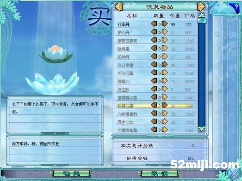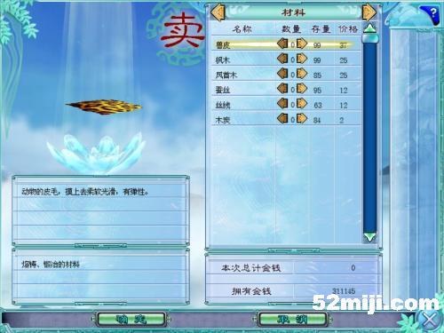 我发现了!一个特好的方法卖!不用一个个的点着上面数!!!不然鼠标都要按破!只需你左手点键盘上的向右的那个建如图1-1中右手拖着鼠标从最上面的那个要买的东西拉到最后一个要买的东西!按着键盘上的那个键不放代表你要不停的卖!而鼠标的上下拖动(卖完一种东西再向下拖鼠标)是代表你选择的要卖的东西!明白了吧!试试看啊!或许你也一下有钱了!真的我是卖的最后好药都有99了呢!但是好心疼啊!打了那么多的妖怪!钱一下就用完了!-_-^