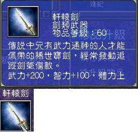 添加String = 15856,传说中只有武力通神的人才能佩带的稀世宝剑,经常发动追踪剑气伤敌。n武力+200,智力+100,体力上限+250,技力上限+200 (15000+物品编号);