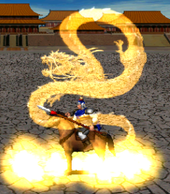 【技能说明】施展时,在武将中心召唤出一条黄龙,黄龙升起,在空中吐出巨大的黄色火球,火球落下,烧死触到的敌军