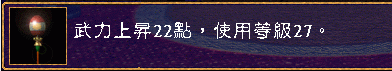 描述 = 武力上升22点,使用等级27。