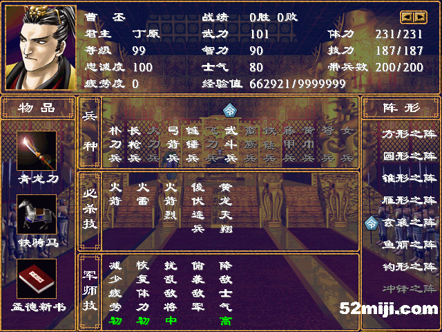 5、曹否武将技稍差,不过火箭烈+后伏连兵+黄龙天翔,也不错。而且他的武力不算太低,早期可以一用。等郭嘉出了狂雷天牢后,可以换上郭嘉。