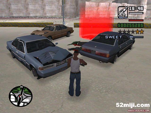 任务The Green Sabre接到Cesar电话,去高架桥下,那有一辆Bravura,这辆用常规方法得不到,因为让任务失败的唯一方法就是自杀,但你死了后,谁来推车啊?但我看着那辆Bravura眼谗,我一定要得到,只有不折手段了,用GTASA CONTROL CENTER才行。 还有围着SWEET老哥身旁的3辆Sentinel,感谢多面人47的回复,我当时都忽略了。原因就是那3辆Sentinel已经破损,而且还冒着烟。无敌的车总是给人崭新的面貌,看这3辆Sentinel,怎么看都没有无敌相,世界上很多东西都华而不实,真正用有用的还是那些朴实无华的东西。事后仔细分析:这跟House Party任务一样,双方帮派在激烈交火,看似激烈,其实双方帮派都是在向对方的车开火,打了半天,那3辆Sentinel也没爆。还有就是你用枪打那3辆Sentinel也打不爆。顺便说一句:把SWEET打死后,再去红圈,会有搞笑的动画。