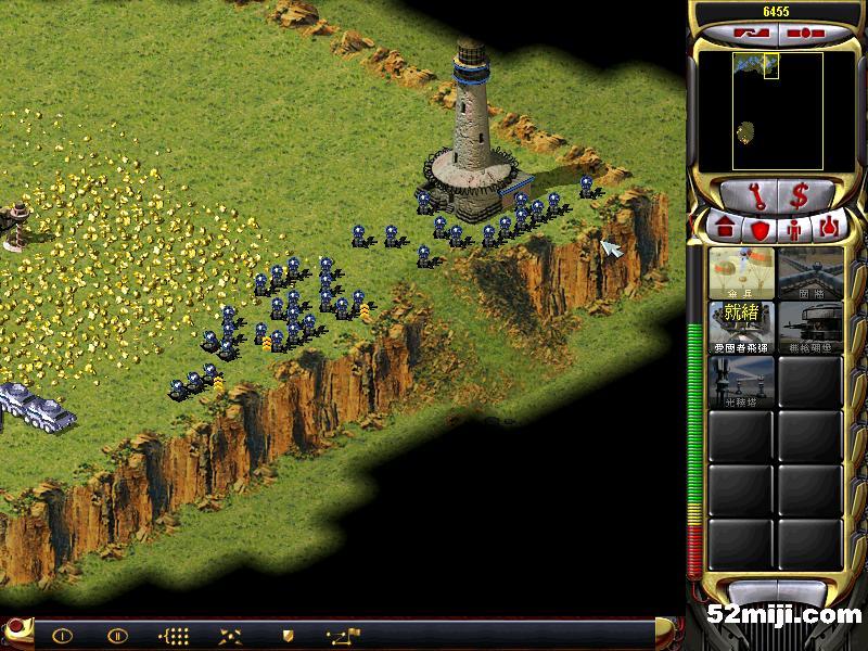 二:等伞兵就绪后,空降到这里(空降到这里成功率是80%,空降到敌人基地旁边成功率是1%),再把他们调往下面到敌人基地旁边(到基地旁边成活率是60%),等够50个伞兵后就摧毁敌人的基地(一定要40到50个伞兵,因为一打基地,敌人的飞行兵和光棱坦克就来解救啦,你再调伞兵过来救难啦)