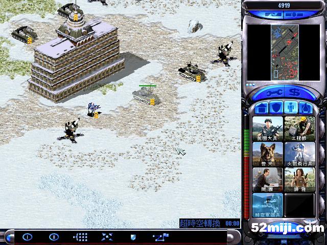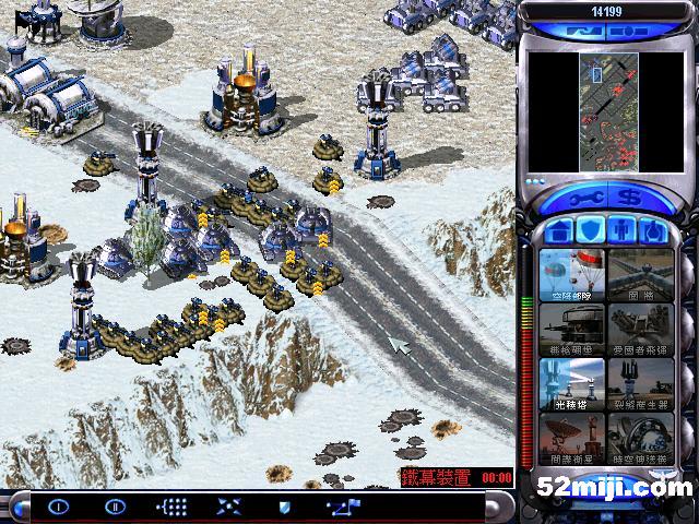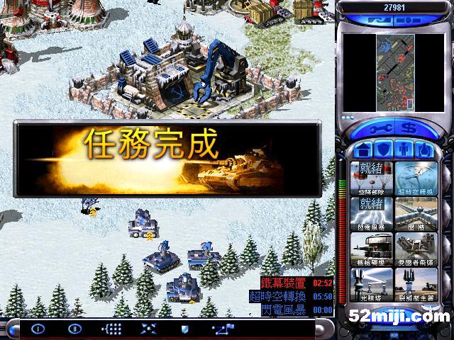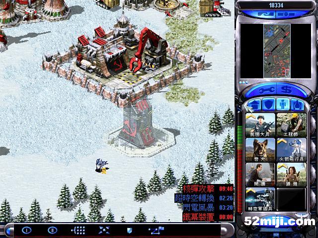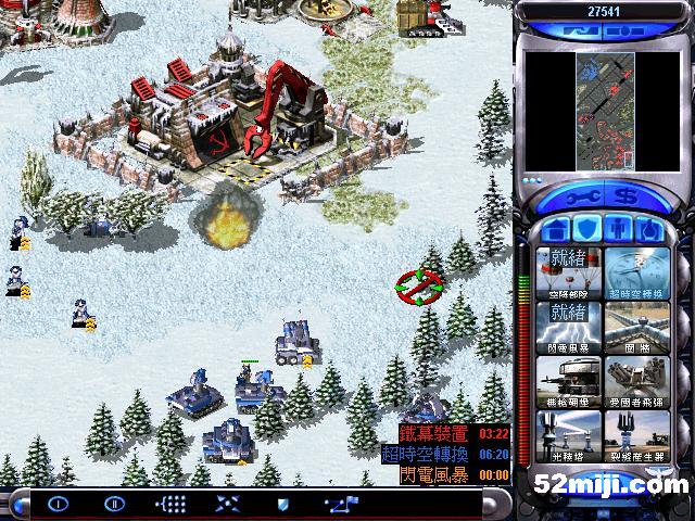 接着造实验室,间谍卫星探开地图,发现敌人基地核弹防御较弱,出超时空3个,2个防御,一个摧毁核弹,顺便把铁幕也摧毁.(如图),