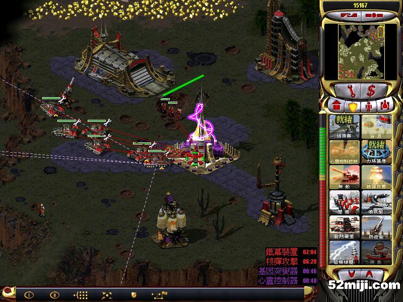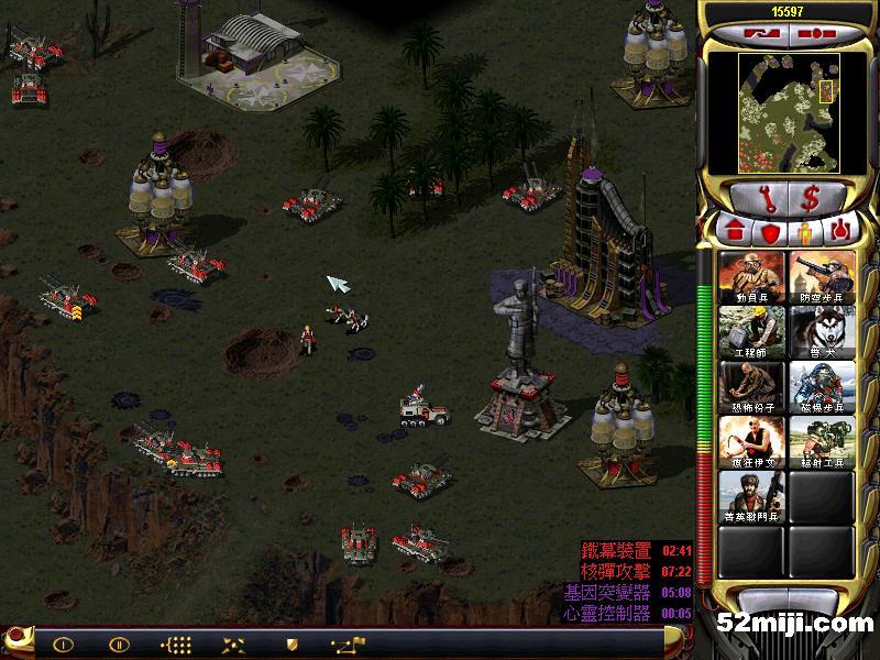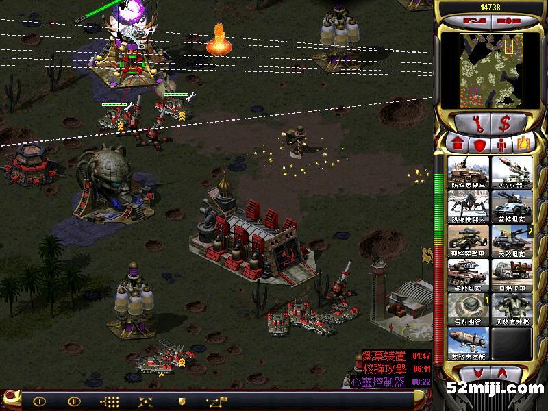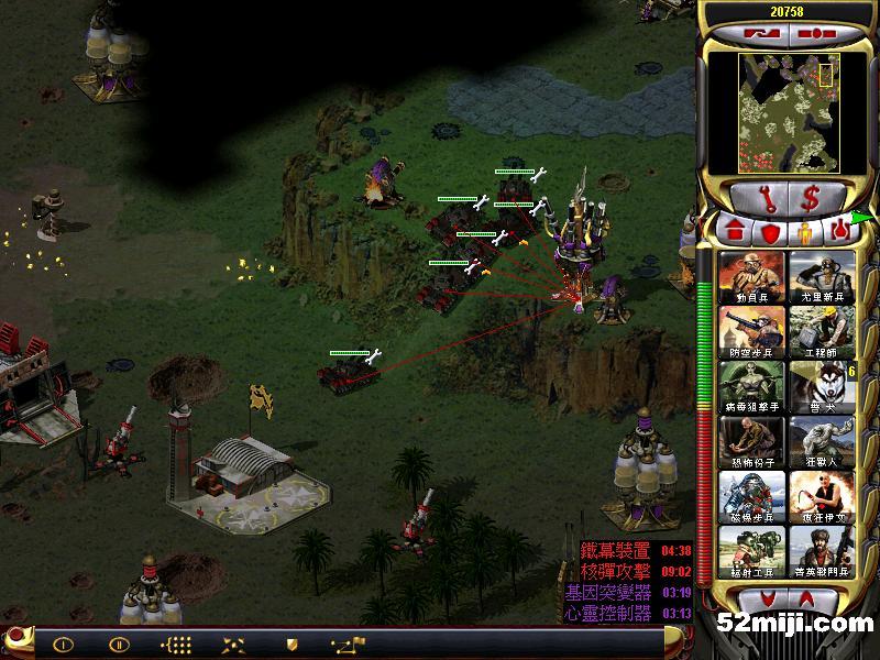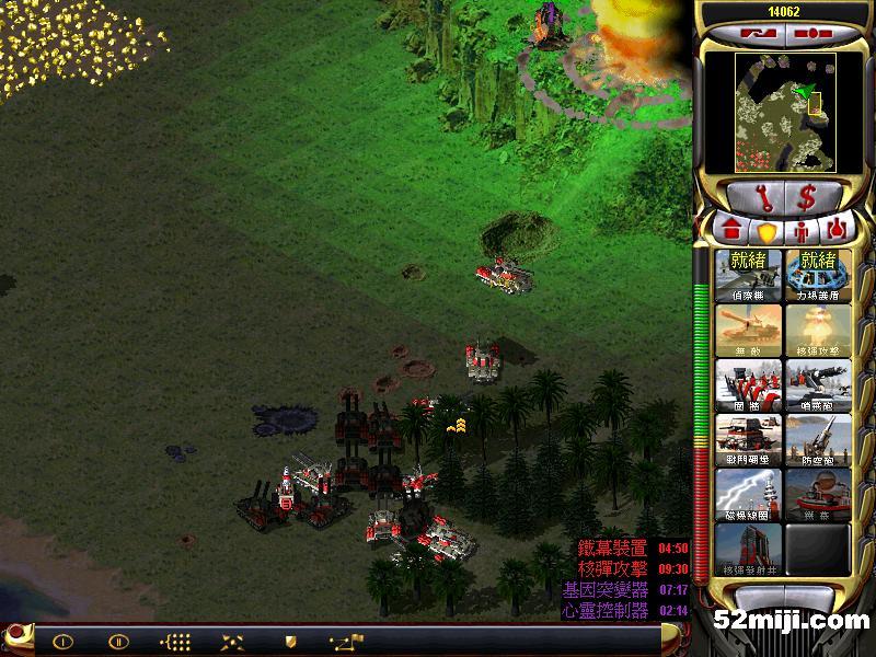 最左边也要注意敌人攻击,稳固防守后,多出天启到达此处(防空车进工程师同往),核弹攻击山口,天启罩上铁幕攻入,占领此处,然后天启坦克分散,防敌人心灵控制,出狗狗,向右消灭尤里(3-5)