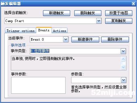 首先在触发编辑器中新建一个触发,如“Camp Start”,然后在“Events(事件)”中新建要触发事件的条件,并设置好参数。(如图所示)