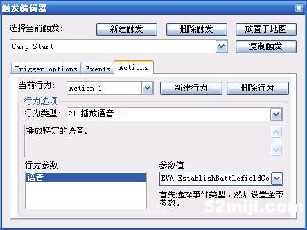 首先创建一个未禁止的触发,如“Game Start”,然后在事件中创建触发条件,如“8 任何事件”。然后在行为中新建行为。这些行为主要包括“21 播放语音...”,“38 成为敌人...”,“99 播放音效...”,“112 移动并居中当前视野到路径点...”,“17 显示路径点周围区域...”,“7 援军(小队)...”等。下面主要介绍“21 播放语音...”和“99 播放音效...”。