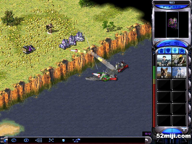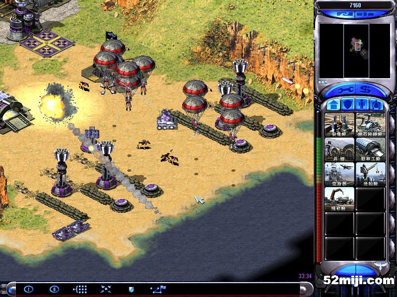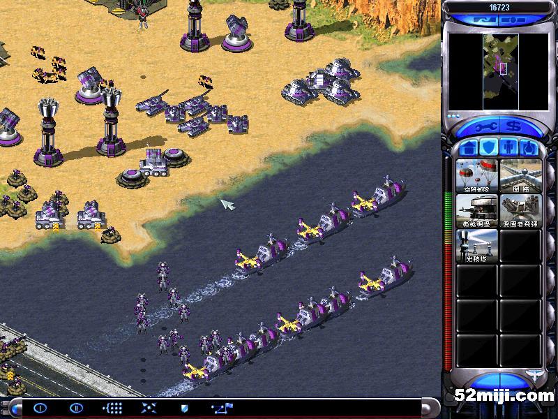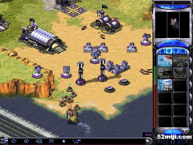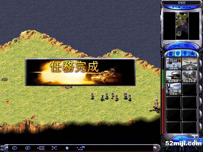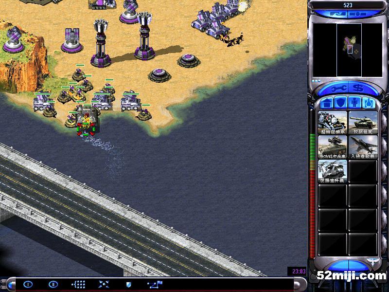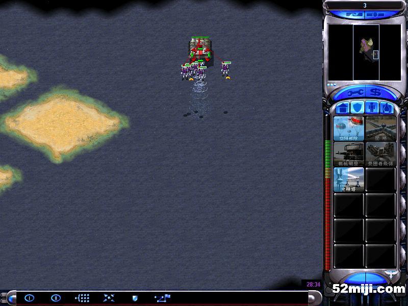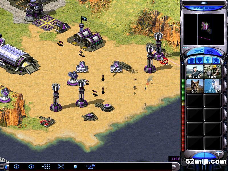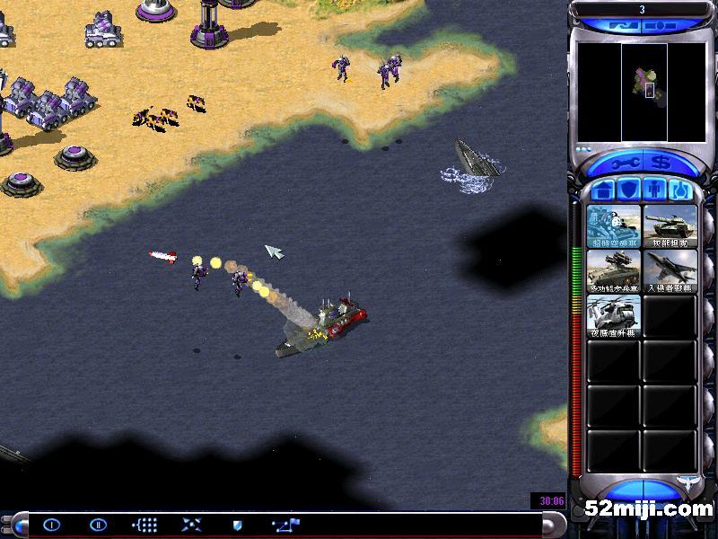 第三关:一开始,先出爱国者导弹,然后步兵车和狗,同时出空指部,要不断维修自己的建筑,以便摧毁敌人第一波天启(1-2)