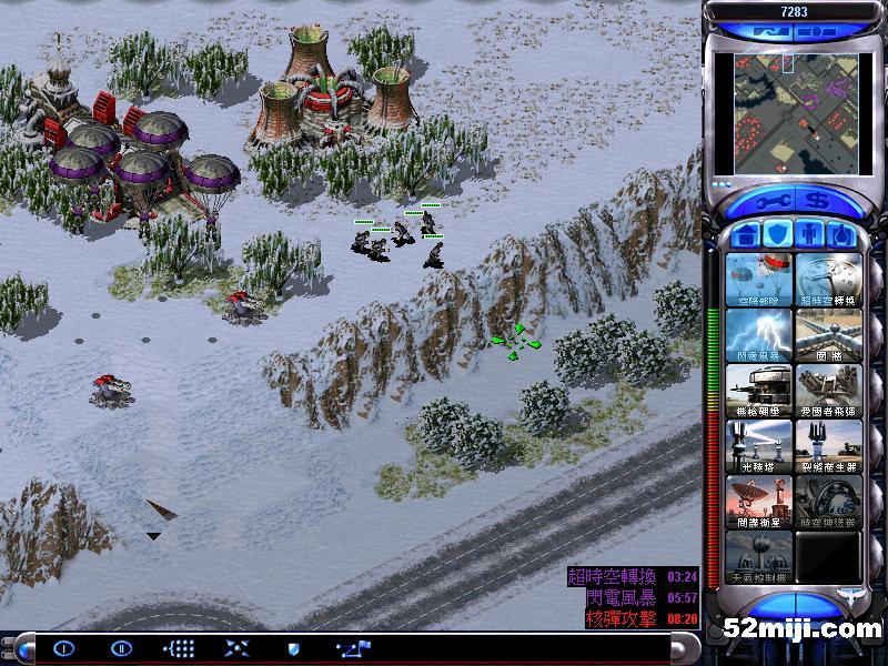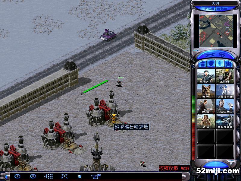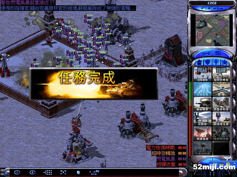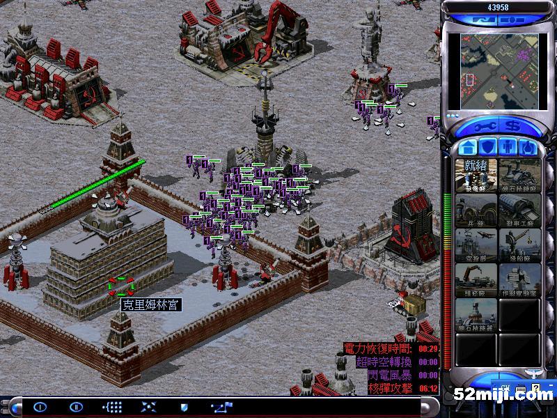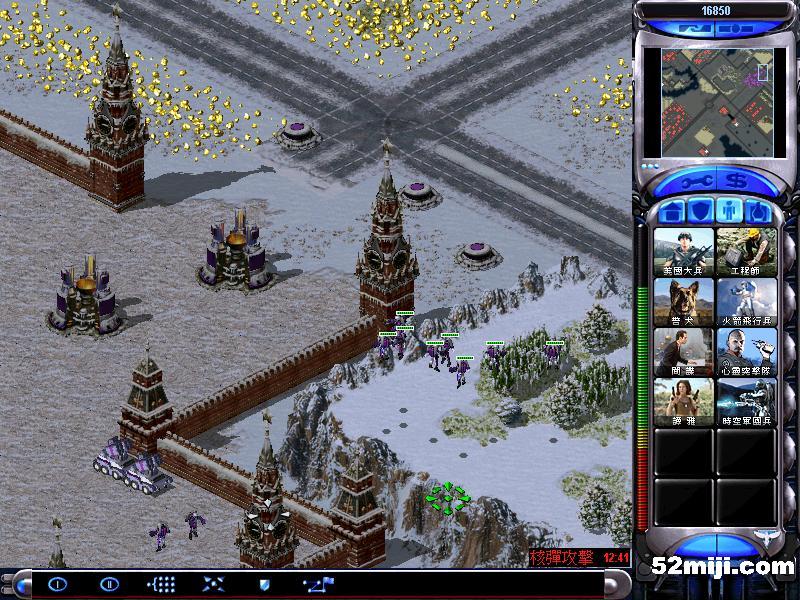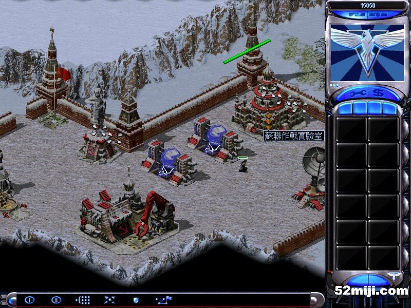 战车工厂建在最北边,多建兵营,多出飞兵,间谍持续进电站,飞兵直扑克里姆林宫,摧毁过关(5-6)