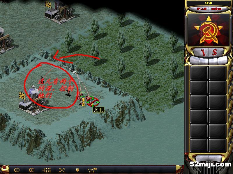 这关一开始出尤里的右边小平台有两个敌间谍,控制他们供自己用