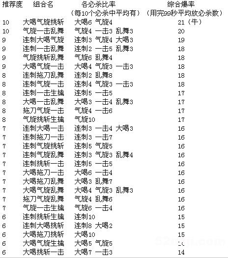 今天又花了不少时间来进一步研究必杀的爆率,终于有了结果,自认为是最齐的了吧,呵呵。。。。。现将必杀技的爆率按照“推荐度--组合--出现率--综合爆率”排列如下(武力100对武力100的武将单条):
