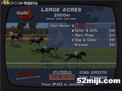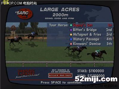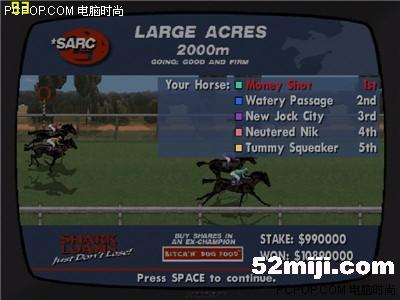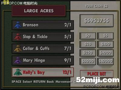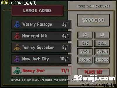 9 当然也有手气背的时候,连输了几盘500万。一气之下把剩下的595万多全都压在了五号马上(输入筹码时摁500多下的空格键摁到我手指都疼了),来个孤注一掷,如果输了,就只剩下3块钱了,jiaoji都不够啊,呜呜(不过,还有一招杀手锏——load game,呵呵,这就是为什么要在电子游艺厅附近买屋的原因了)。
